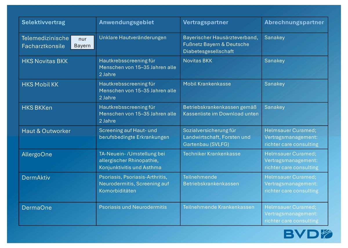 Die Vertragsarbeitsgemeinschaft der Betriebskrankenkassen in Bayern (BKK VAG Bayern) hat mit dem Berufsverband der Deutschen Dermatologen (BVDD), der Versorgungsgesellschaft der Fachärzte für Dermatologie, der Ärztlichen Vertragsgemeinschaft Deutschland und der Sanakey Contract zum 1. April 2022 einen bundesweit einheitlichen Vertrag zur Hautkrebsfrüherkennung geschlossen. Der Vertrag geht weit über die Regelversorgung hinaus und wird digital unterstützt.