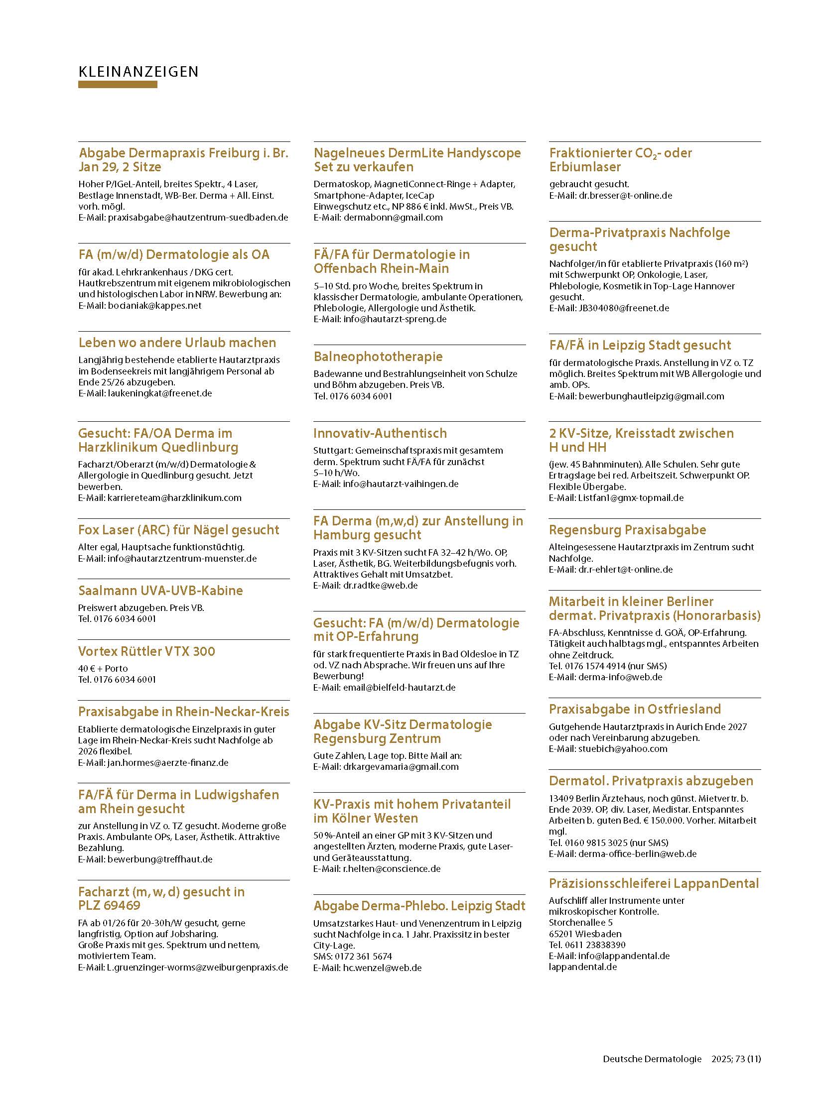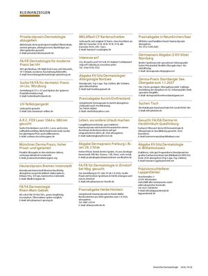 Suchen Sie eine Praxisvertretung? Haben Sie Medizingeräte abzugeben oder sind Sie selbst auf der Suche? Hier haben Sie die Möglichkeit, eine Kleinanzeige in Deutsche Dermatologie aufzugeben.